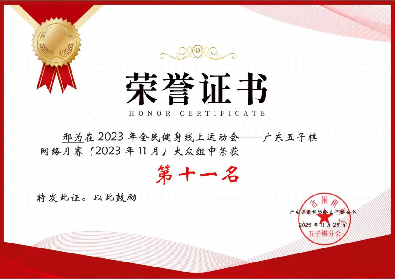11月25日13:30,广东五子棋网络月赛(2023年11月)在五林五子棋APP上如期开赛,伟德BETVLCTOR体育平西棋社成员邢为参赛,并以总分4.5分获个人第十一名。