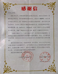国势之强由于人,人材之成出于学。各地方组织在来信中表示,青年学子的无私奉献精神,主要得益于学校对学生思想意识形态的正确引领和高尚品德的大力塑造,强调平顶山学院是众多大学院校里的一杆旗帜。