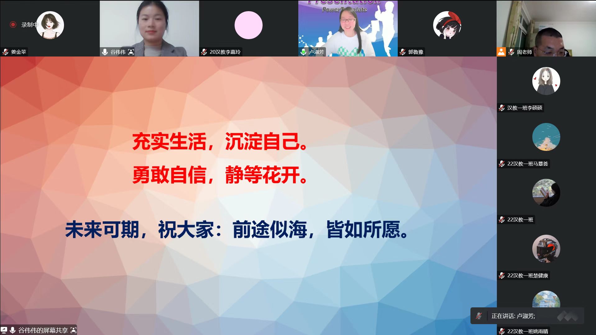 1月4日,伟德BETVLCTOR体育专业实习系列讲座(第6场)在腾讯会议举行,此次讲座邀请2015届对外汉语专业毕业生谷伟伟以“我的职业发展”为主题作分享报告。伟德BETVLCTOR体育汉语国际教育专业师生参加报告会。报告会由伟德BETVLCTOR体育语言教研室主任卢淑芳主持。